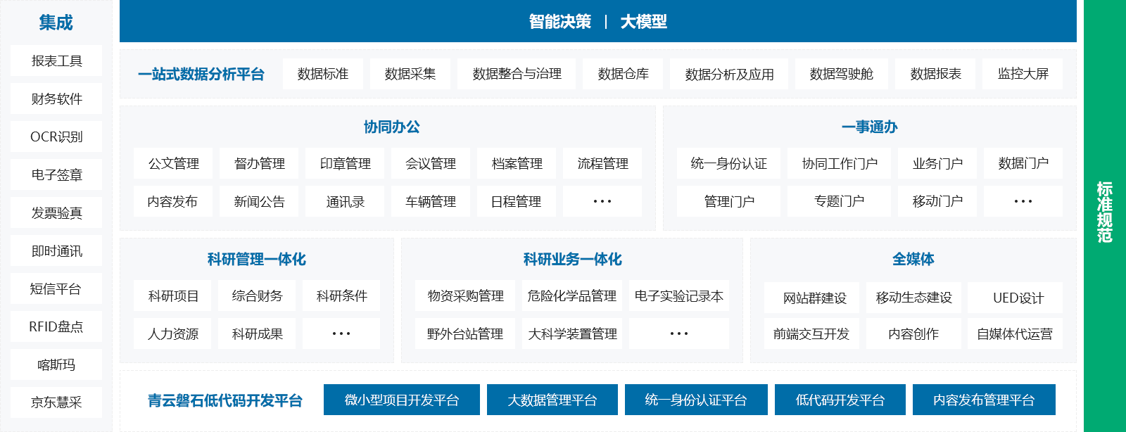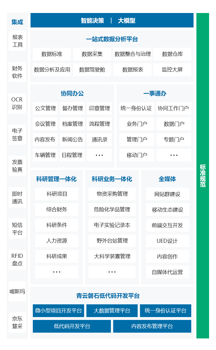 輔助決策平臺(tái)是基于科研數(shù)據(jù)和科研指標(biāo),利用先進(jìn)算法、可視化、大模型等技術(shù),為科研決策者提供數(shù)據(jù)支持和建議的信息化系統(tǒng)。平臺(tái)為科研單位建立數(shù)據(jù)標(biāo)準(zhǔn),搭建數(shù)據(jù)中臺(tái),將內(nèi)外部科研數(shù)據(jù)進(jìn)行有機(jī)融合,讓科研決策者一手掌握本單位科研項(xiàng)目、經(jīng)費(fèi)、資產(chǎn)、科研成果、人才隊(duì)伍建設(shè)情況,了解國家/同行業(yè)單位發(fā)展趨勢(shì),找準(zhǔn)本單位科研水平所處位置,制定人才引進(jìn)、經(jīng)費(fèi)申請(qǐng)、資源配置相關(guān)制度和戰(zhàn)略規(guī)劃,從而提升本單位整體科研能力。